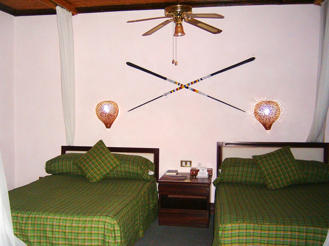 広いお部屋には、ファンと蚊帳があり快適。バルコニーも付いています。